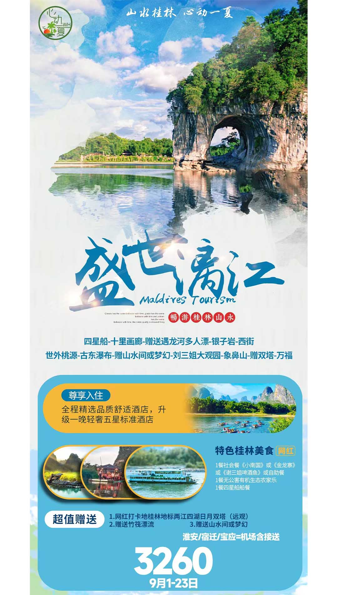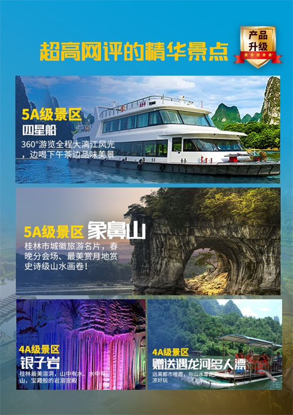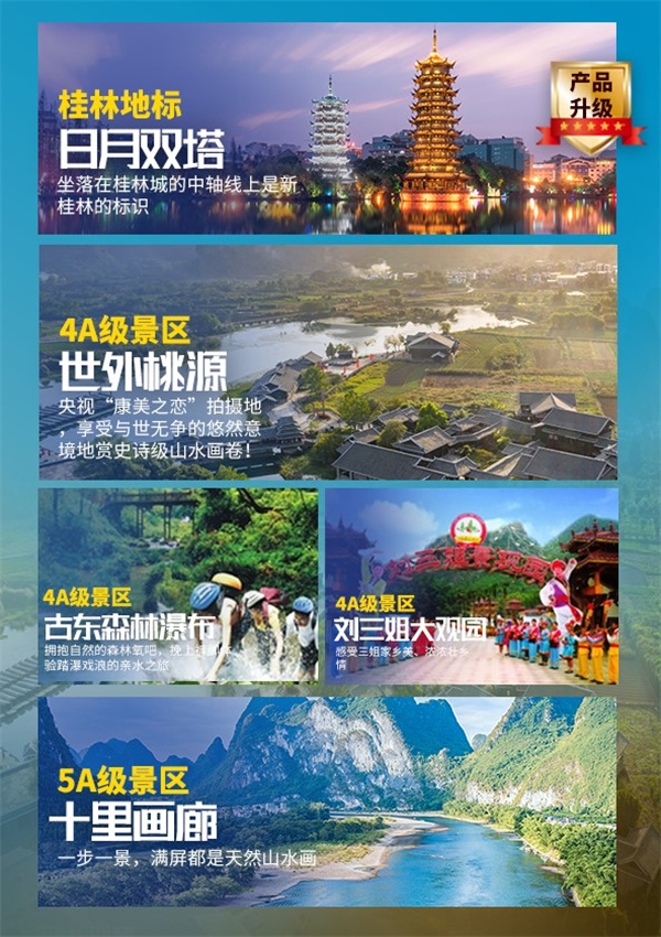 甄選行程溫馨提示:1、行程中列舉的時間為參考時間,具體出發(fā)/抵達時間以當(dāng)?shù)貙嶋H情況為準(zhǔn),如遇到堵車,景區(qū)排隊,漓江水位大小等特殊情況,游覽順序以及游覽時間根據(jù)當(dāng)?shù)厍闆r適當(dāng)安排。不再另行通知,敬請諒解?。?!2、如因自然原因和政策性因素等造成不能參觀景點,我社按照團隊優(yōu)惠價格只現(xiàn)退門票。
