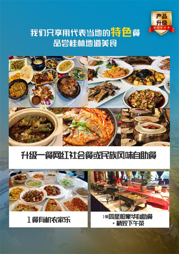 備注:桂林為國家三線以下旅游城市,酒店各項標(biāo)準(zhǔn)偏低,主要以衛(wèi)生舒適為主,提前做好心理準(zhǔn)備哦!如客人對上述參考酒店安排不滿意,處理方案如下:1、按實收價格退給客人自行訂房,2、可自補當(dāng)時差價升級客人滿意的更高標(biāo)準(zhǔn)酒店!3如若遇以上酒店無房情況下,可安排同等酒店,如我社拿到比計劃酒店檔次更高且價格等同的情況下,可以給客人免費升級!